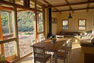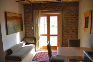 The Studio Flat: Private Self-catering Accommodation Sleeps 2 + a small child on sofa The Studio Flat is situated near the old Karoo farmstead at the end of a 2km private road in a beautiful secluded valley on the Touw River. Accommodation is comfortable, welcoming and fully equipped with hot water, electricity, capped WiFi internet and cell phone reception. Glazed patio doors give access to outdoor seating and braai area. A second shaded outside area is north-facing - making full use of the early morning and winter sunshine. Insulation and solid walls ensure comfort in both summer and winter, and a wood burning stove and heated wall panel next to the bed ensures cosy winter nights. The accommodation is spacious open plan with double bed, kitchenette, living and dining areas and separate shower room. It has high reed ceilings and stylish modern décor. The double patio doors open onto beautiful views of the koppies, the Touw River, distant Langeberg and Touwsberg mountains and breath-taking sunsets (weather permitting!). The Flat is fully equipped for self catering. Home cooked meals can be pre-arranged and freshly baked bread, farm eggs from our 100% free range chickens and any other organic farm or locally produced fresh produce can be purchased when available. Things to do: A short wander through Acacia and Kareedoring thicket will take you to the river and its grassy banks or sandy beaches for a swim in the rock pools when it's full or just to sit amongst the reeds and listen to the birds. A walk in the opposite direction sets you on another adventure exploring the magical mini-valleys, dry river beds, fossils and strange succulents in the northern section of the farm. If you cross over the river, you can explore more riverrine thicket and bushveld, deep klofies and tall Karoo koppies with beautiful fossils, boerboon and gwarrie trees and even small cliffs for the more adventurous scramblers. Come and have a look at how we grow vegetables naturally and organically and raise happy free ranging chickens.