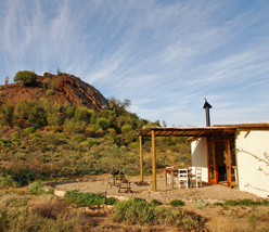 Private Self-catering Accommodation Sleeps 4 adults + 4 children Red Rock Cottage is situated away from the farmhouse and Studio Flat in a secluded copse of trees at the foot of a beautiful red sandstone outcrop, called Red Rock. The setting is sheltered and peaceful with views towards the sunset and nothing but acacias, Klein Karoo koppies and veld. The cottage comprises two spacious double en suite bedrooms. Each bedroom has it's own separate entrance and the en suite bathrooms with showers are super modern, spacious and completely private. A sofa bench in each room doubles as a single bed for children or adults. The first bedroom has it's own fireplace and a small private stoepie with seating at the back of the cottage. The living area is open plan and consists of a fully equipped kitchen with a gas stove and lots of storage. The dining area sits adjacent to large windows and glass patio doors, opening onto the outside living area and views of pure Karoo koppies and veld. The lounge area has comfortable sofa benches which also double as single beds for children. The free-standing fireplace ensures cosy winter nights. Glass patio doors open onto the private outside space with table and seating plus braai. If you are not the braai type; there are patio fires to keep you warm outside whilst enjoying the spectacular Karoo night skies. Things to do: Have a picnic on Red Rock and watch the full moon rise or head to the nearby dam (after rains) to watch the water birds and terrapins bop in and out of the water. A 10-minute amble will take you to the river and its grassy banks or sandy beaches for a swim in the rock pools when it's full or just to sit amongst the reeds and listen to the birds. A walk in the opposite direction sets you on another adventure exploring the magical mini-valleys, dry river beds, fossils and strange succulents in the northern section of the farm. If you cross over the river, you can explore more riverrine thicket and bushveld, deep klofies and tall Karoo koppies with beautiful fossils, boerboon and gwarrie trees and even small cliffs for the more adventurous scramblers. Come and have a look at how we grow vegetables naturally and organically in our permaculture gardens and meet out happy free ranging chickens.